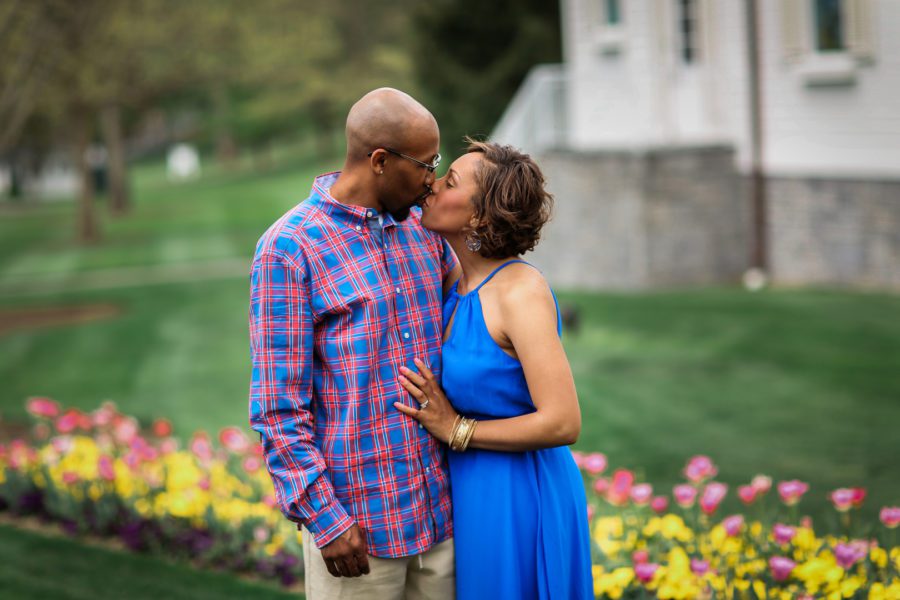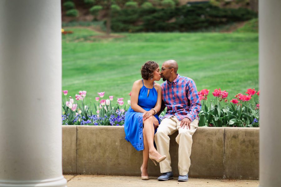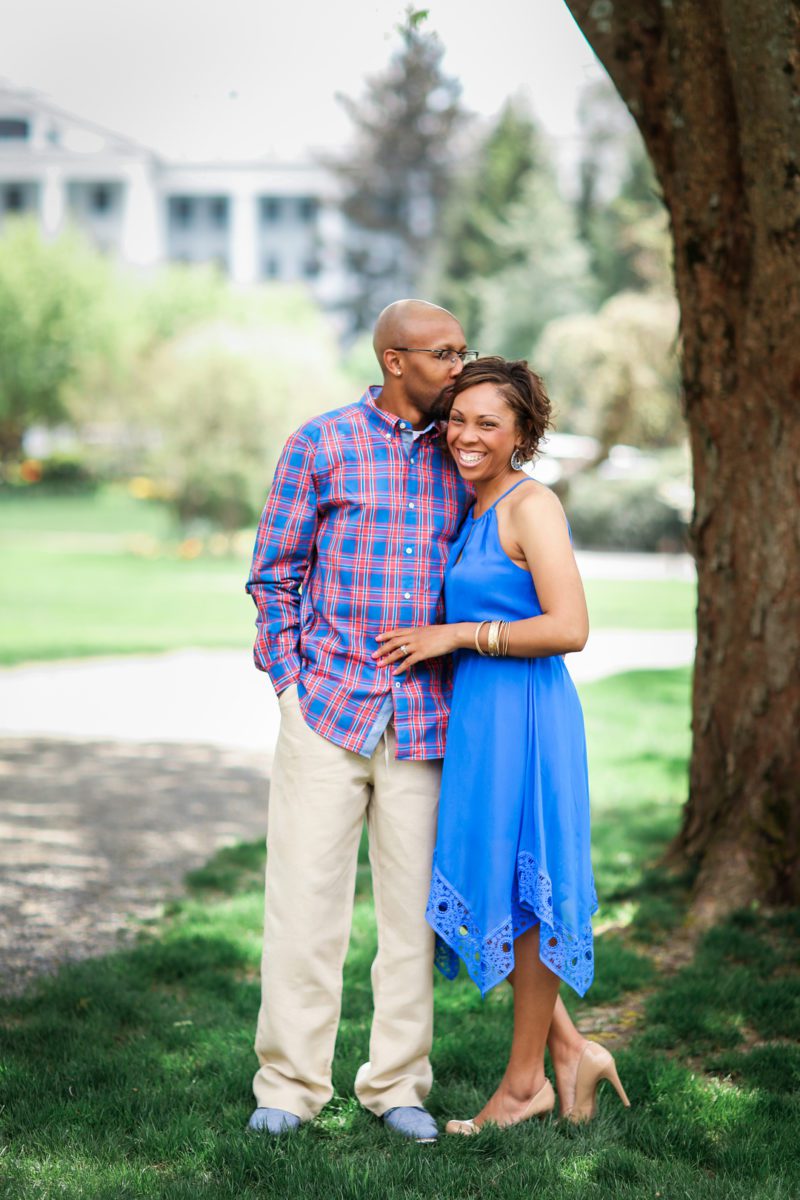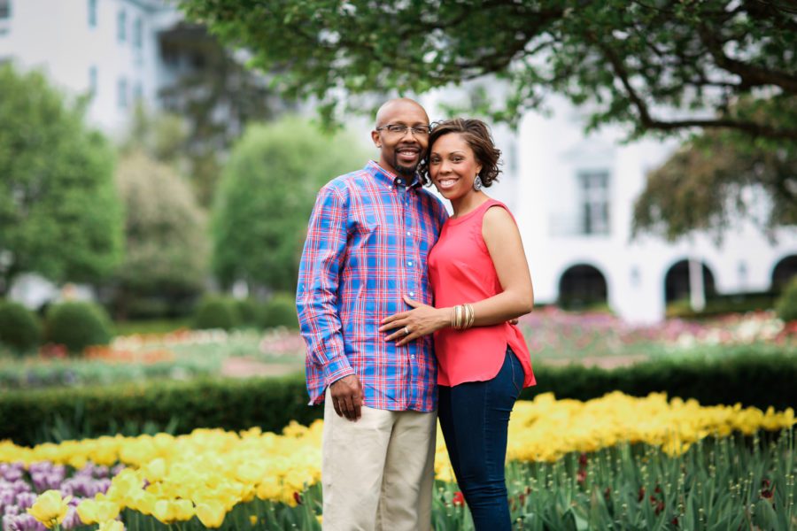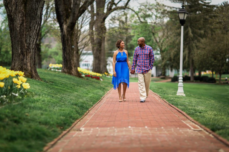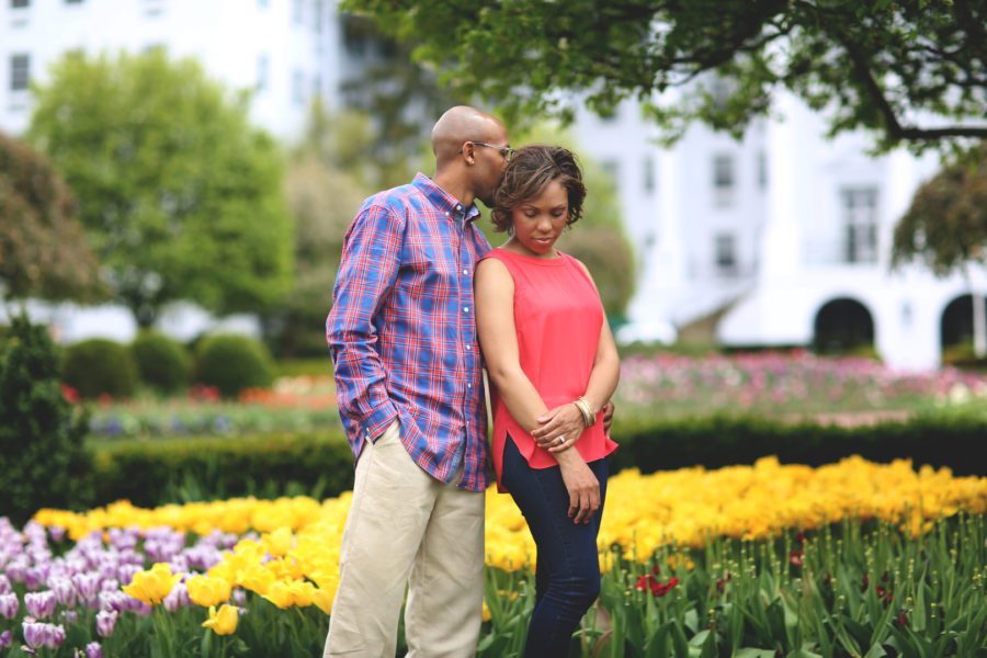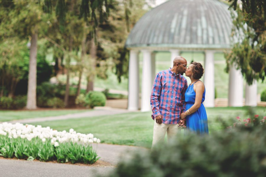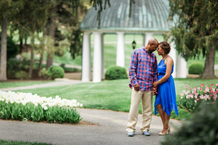 With lots of scheduling conflicts throughout the course of our correspondence we ended up shooting midday with Keisha and Larry at The Greenbrier Resort in White Sulpher Springs, West Virginia. If super sunny, the plan was to shoot our entire engagement session indoors, and while The Greenbrier is breathtaking (inside and out), it was really my hope for an overcast day so we could take advantage of the beautifully landscaped grounds at America’s Resort. It seems Mother Nature was partially on board and decided to give us a cloudy day, and while we spent a lot of our time waiting for the sun to go back behind a cloud, it also gave me a chance to get to know Larry and Keisha more! It’s such a small world, because Keisha and I know a lot of the same people, even though we had never met!