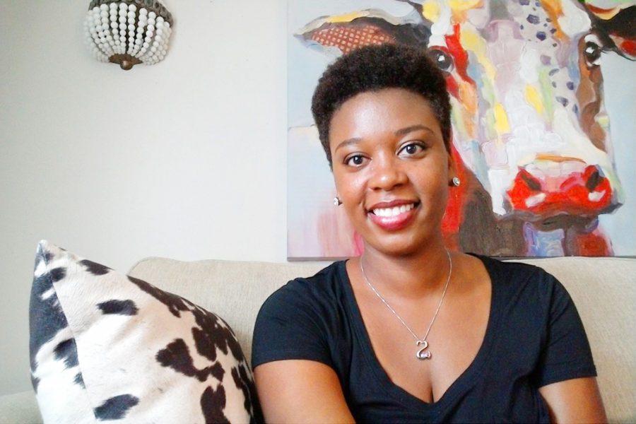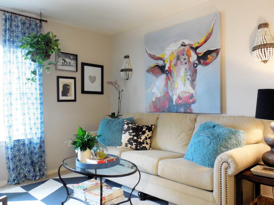 My living room is my favorite room in my apartment, because it’s comfy, bright, and has a lot of color. I also have a lot of my favorite pieces in my living room, like my framed leopard art, framed afro girl, cow art, and black and white rug.