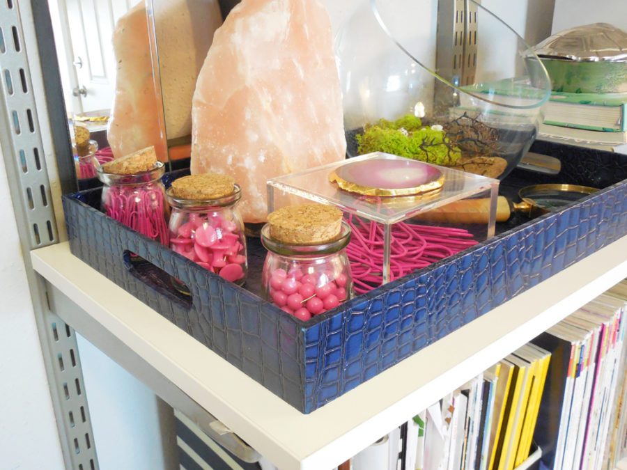 What I loved most about decorating my office is adding in the decorative accents. My office is pretty industrial, using a storage system with exposed baskets and brackets, so it was important to me to bring in something pretty. I really love my blue tray with my office supplies and my gallery wall.