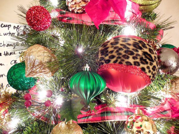 My favorite decorative pieces for the holidays are candles, a large Christmas tree, and my leopard ornaments.