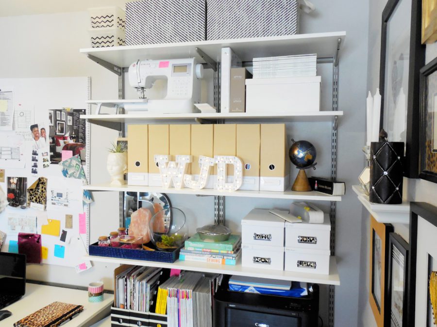 My office is made mostly of a really cool storage system (usually seen in closets and pantries) and a worktable that I painted black. What I love most about my office is the drawers of my storage system. They stylishly hide my pens, markers, catalogs, and notebooks.
