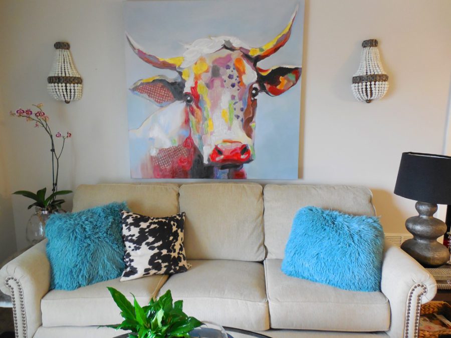 My mom and I usually NEVER agree on anything related to decor. But, while shopping one day, she saw my large cow art at the same time as I did and said, “This is so you”! It was a really bold choice, and I probably wouldn’t have purchased it if she didn’t motivate me. I’m so glad she did, because I’m in love with it.