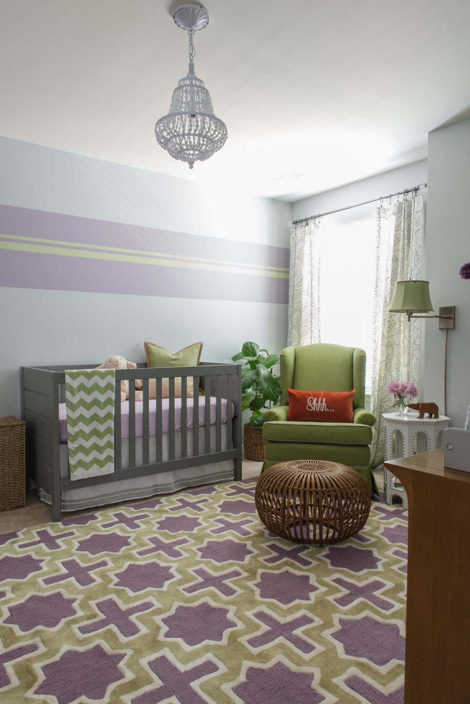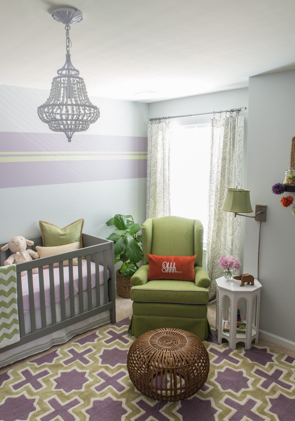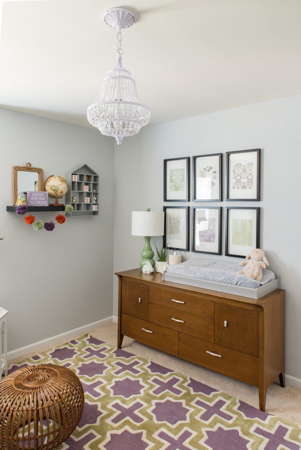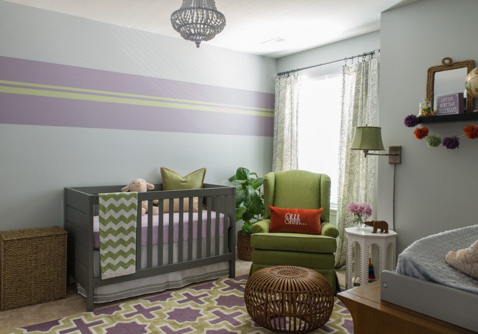 Drapes are a must in almost all of my projects and a nursery is no exception. They add softness to the walls and they’re also a great opportunity to inject a good dose of color and/or pattern. To make things a bit more youthful, we added a purple pom-pom trim to the gray and white patterned panels.