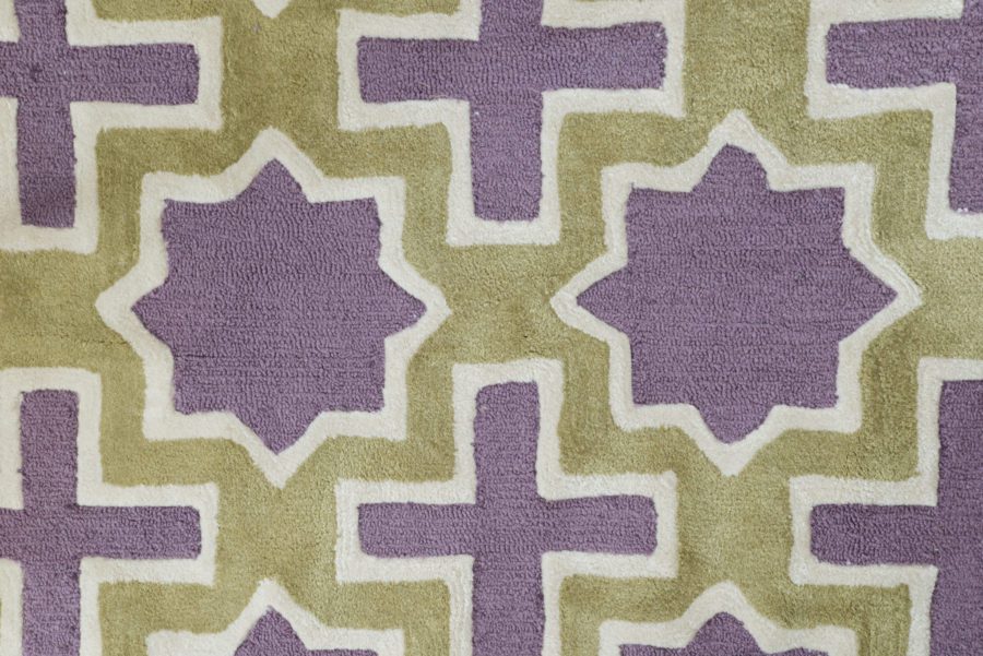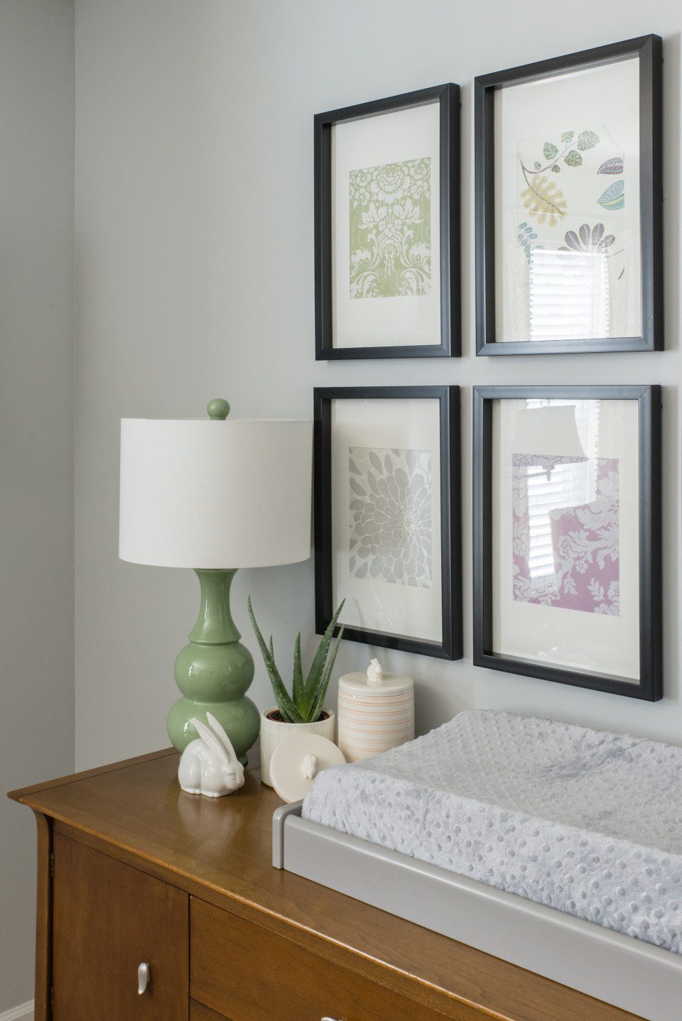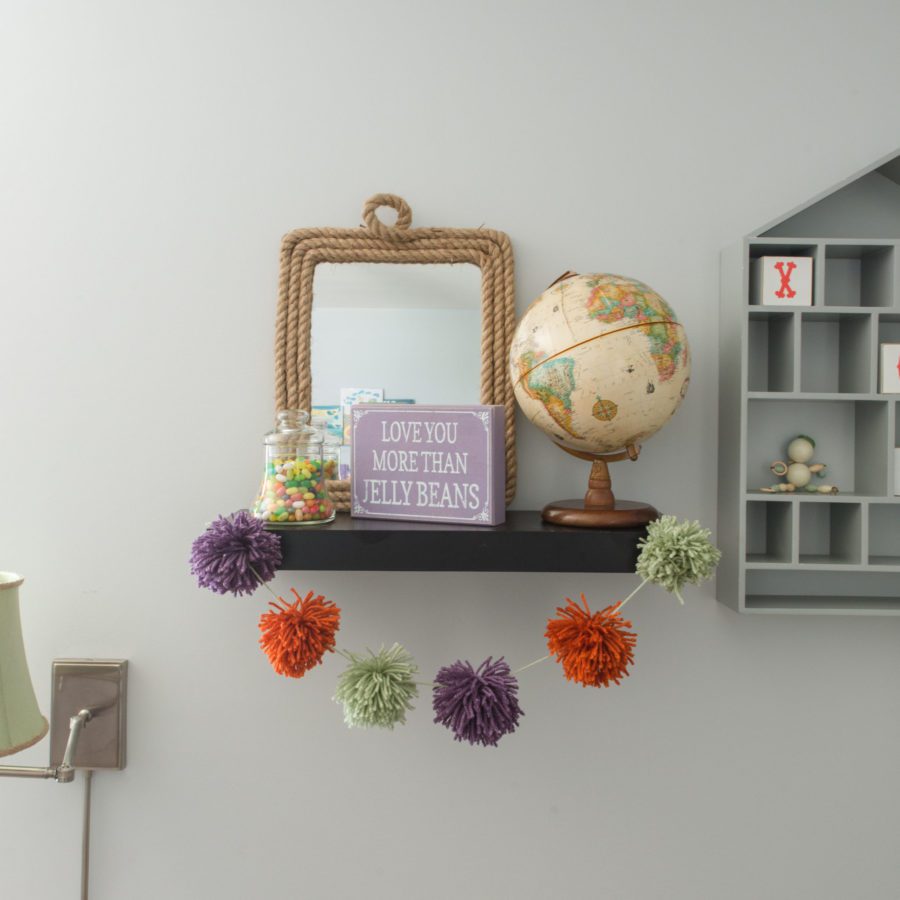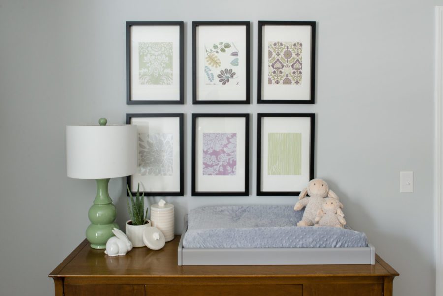 Drapes are a must in almost all of my projects and a nursery is no exception. They add softness to the walls and they’re also a great opportunity to inject a good dose of color and/or pattern. To make things a bit more youthful, we added a purple pom-pom trim to the gray and white patterned panels.