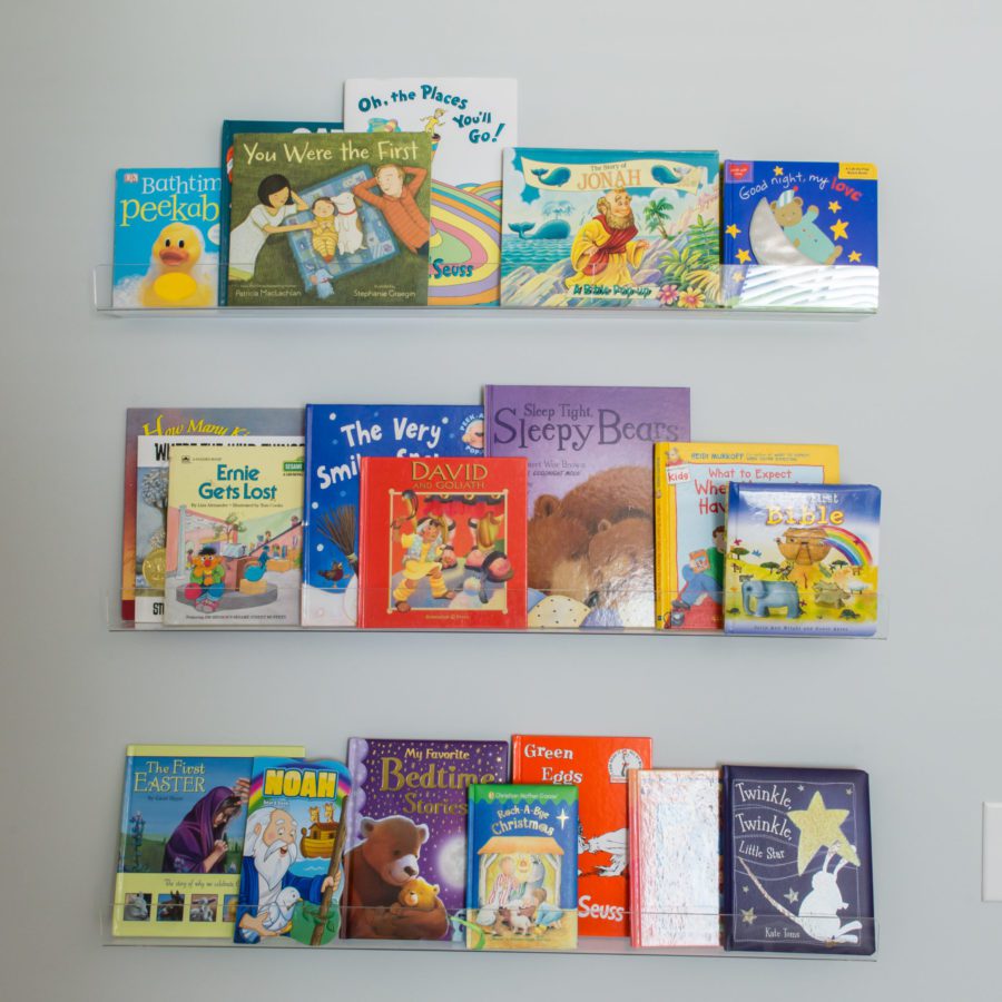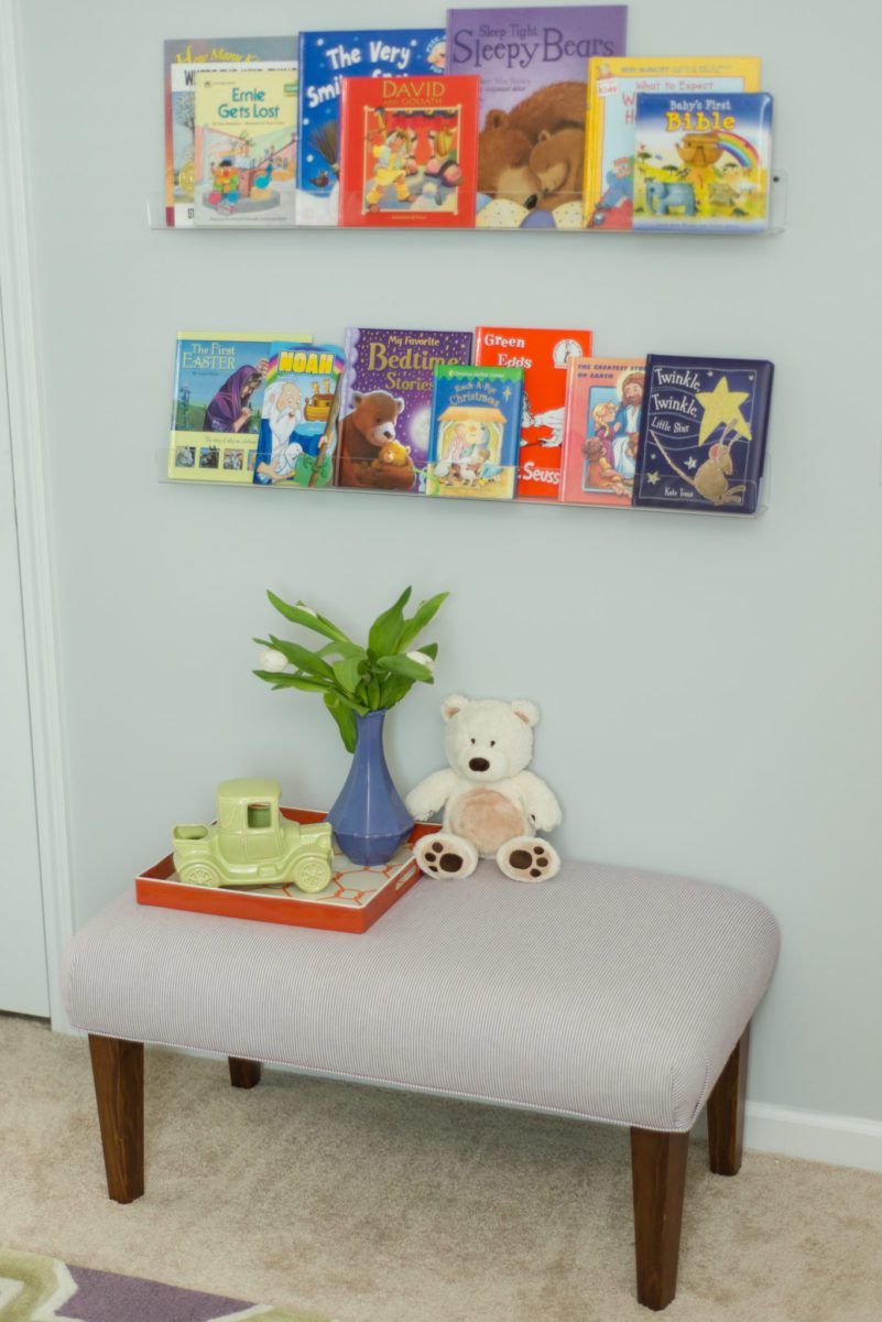 The client really wanted to include a space for books. We added the acrylic wall shelves and a bench beneath that will soon be the perfect spot to read to the little one.