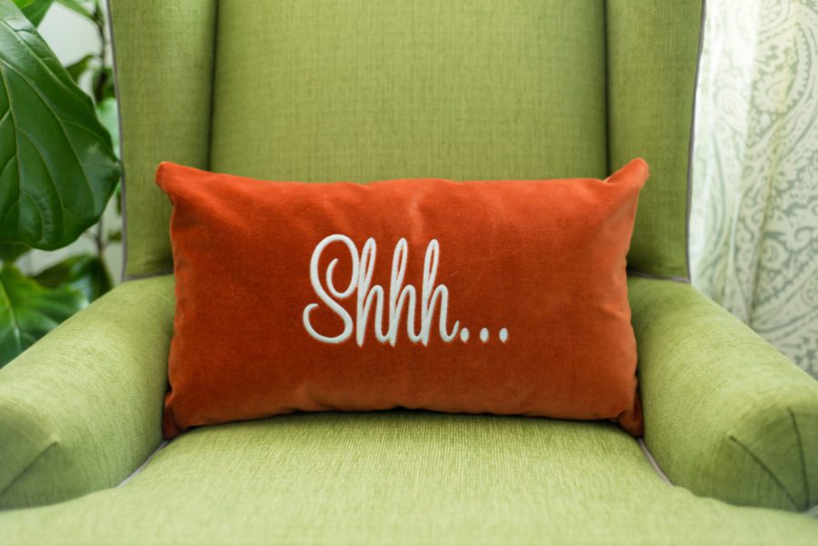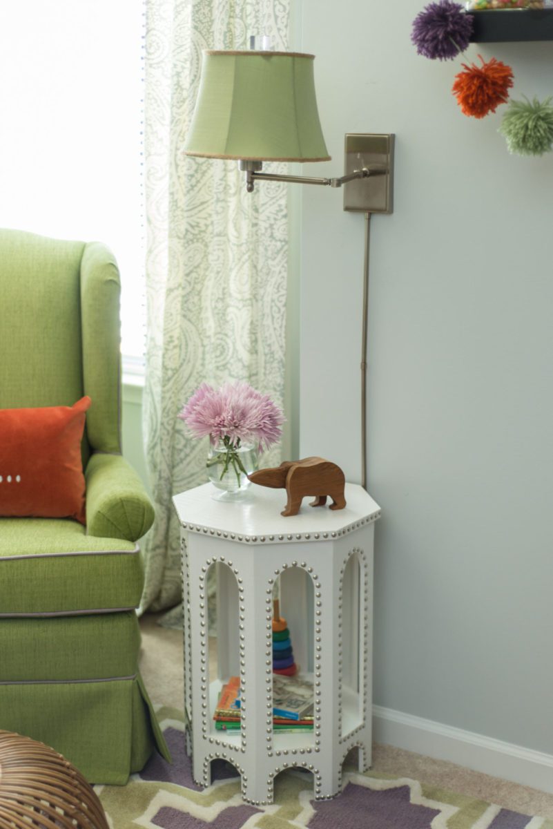 Almost all of my projects include a reinvented furniture piece. In this case it was the wingback rocking chair. I knew we need a rocker or glider but wasn’t thrilled about the options available within the project’s budget. I relied on my upholsterer to help reinvent a vintage rocker I picked up at one of our local Habitat ReStores. The addition of a water resistant fresh green fabric with a contrasting purple cording was the perfect combo of form and function.