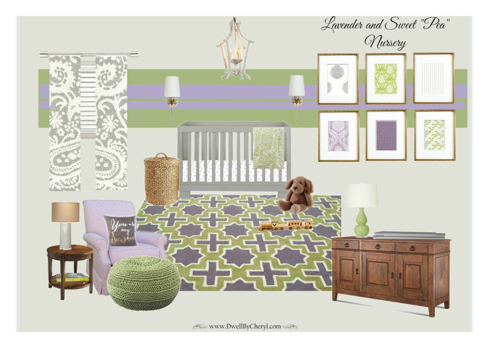 The color scheme was born from a beautifully designed living room space I pinned on Houzz. I fell in love with the lavender and soft green with a tiny touch of Hermes orange.