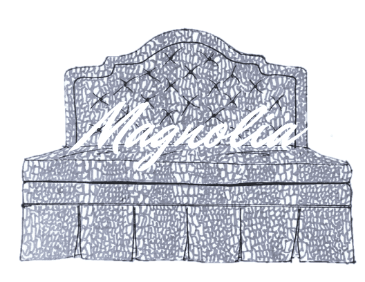 For this piece, Cheryl says, “Magnolia, named in honor of my home state Mississippi, provides a southern take on the classic banquette. It’s headboard- inspired seat back boasts a striking curved detail, bordered frame, and button tufts. This elegant piece is finished off with a pleated skirt indicative of the formality and grandeur of the Southern home.”