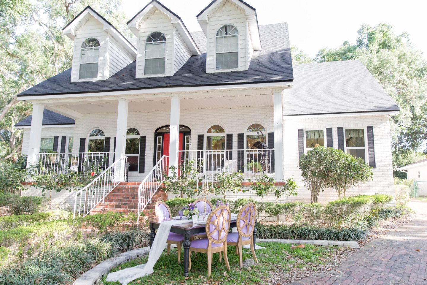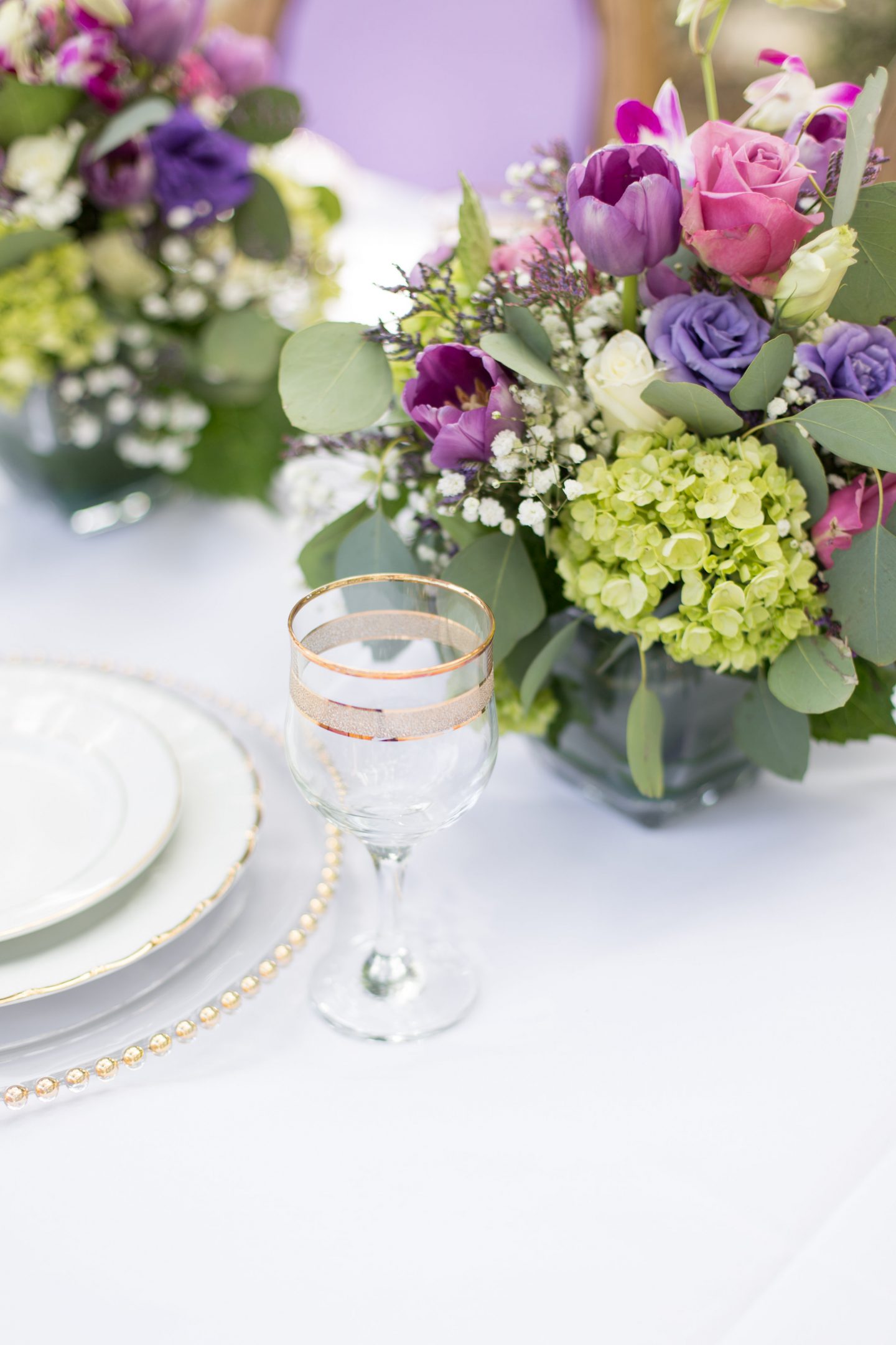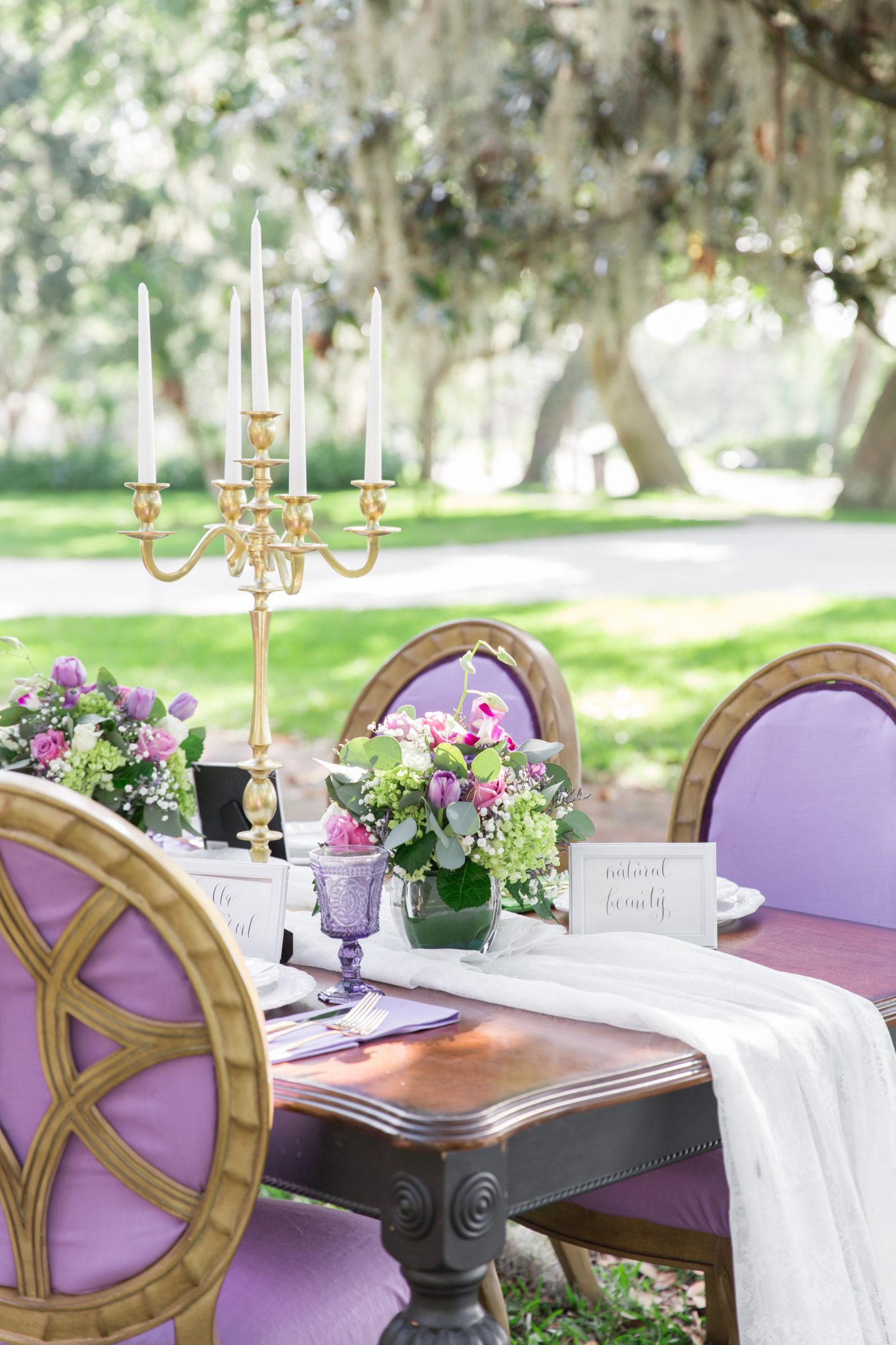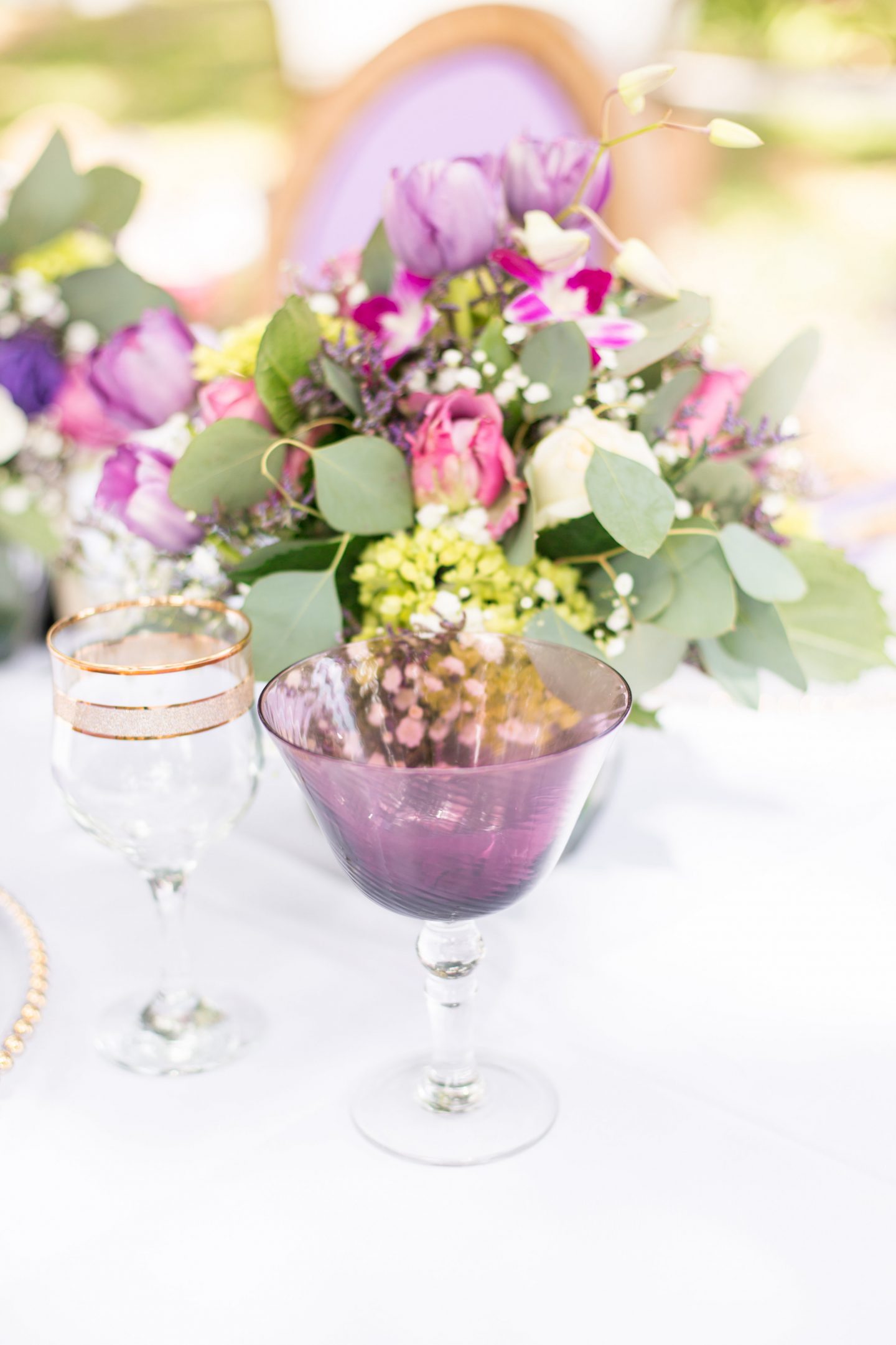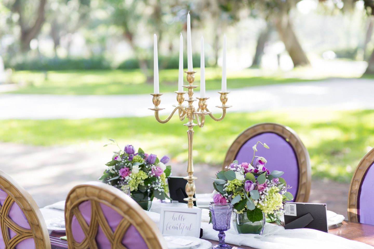 The antique table that we used was too beautiful to not show. So, we left it bare and accented it with a floor-length lace runner. Adorned on the table was country chic embellished milk white plates. The floral centerpieces is what we used to bring in that extra touch of color. Again, purple was the star of the show with accents of lavender, different shades of green and fuchsia. Rather than use the normal white napkins, we decided to pull from our centerpiece and mix and match purple and green napkins and do the same for the vintage glassware. To add just a touch of elegance we placed a single five arm matte finished gold candelabra.